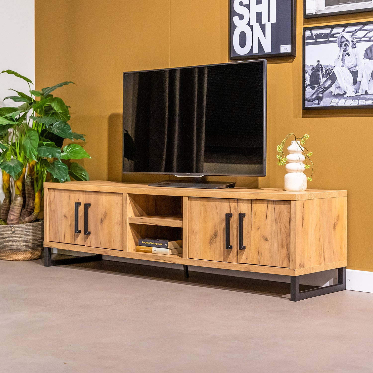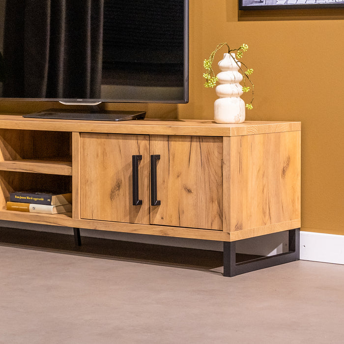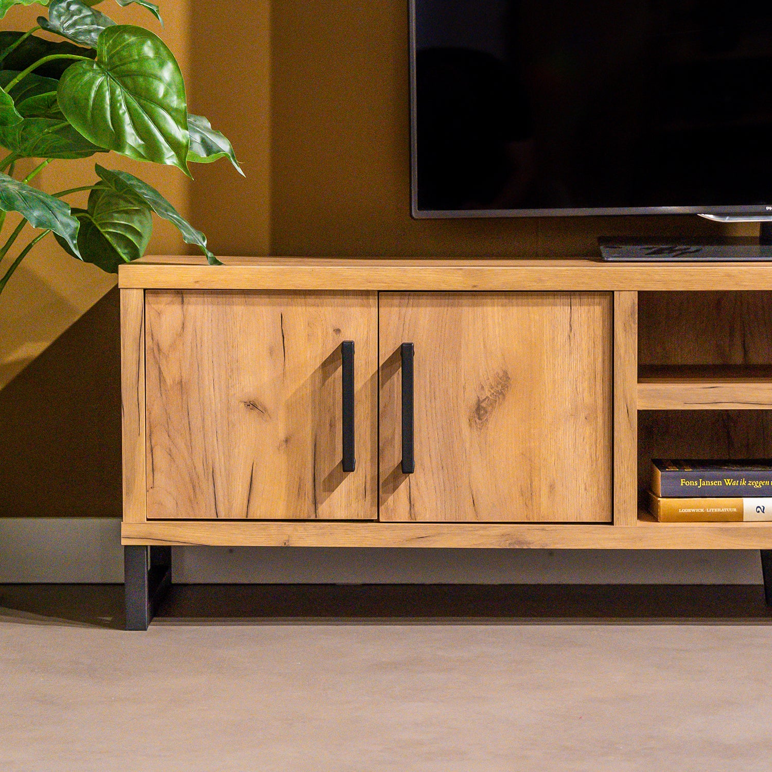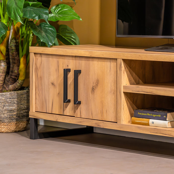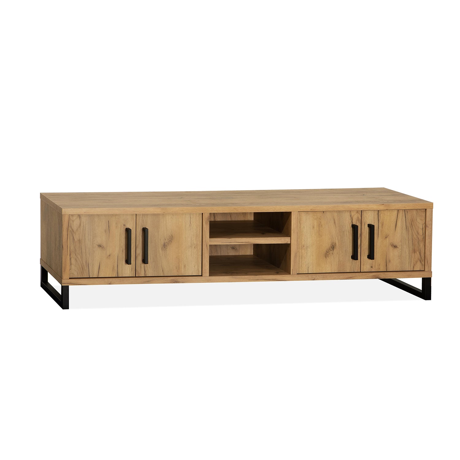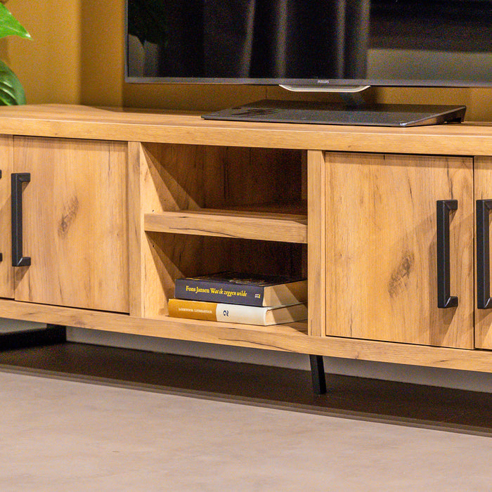 Tv-meubel Ronda valt op in jouw interieur door het moderne design. De meubelpaneel houtlook gecombineerd met het zwart metalen onderstel en metalen handgrepen, zorgt ervoor dat dit tv-meubel in veel interieurs past.