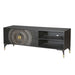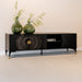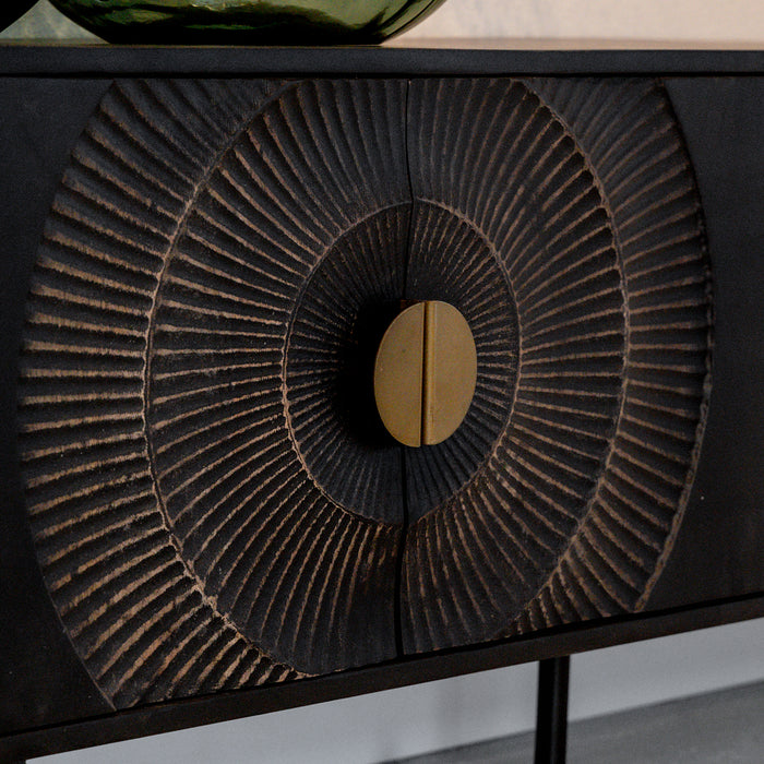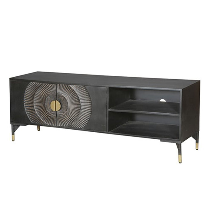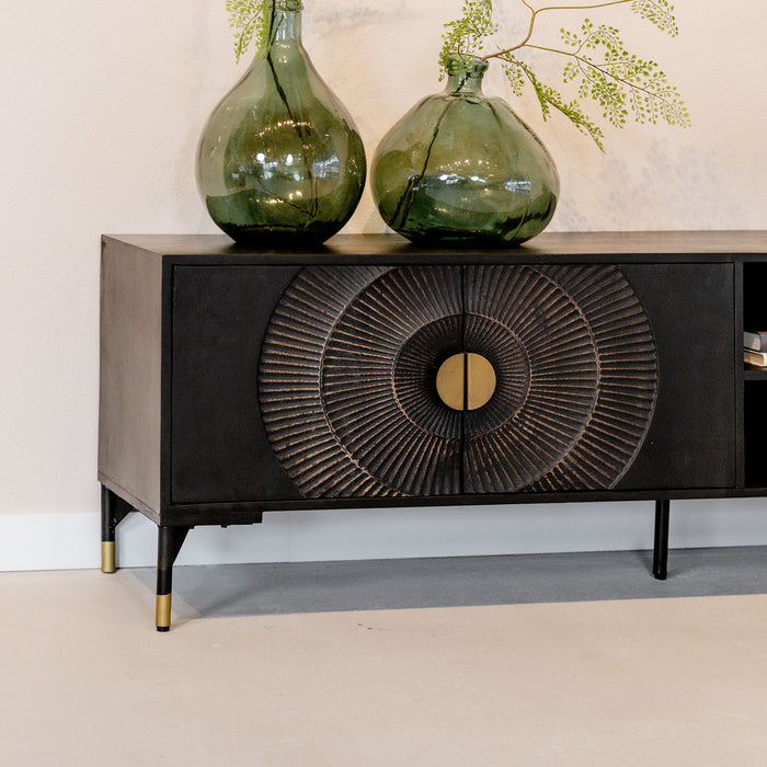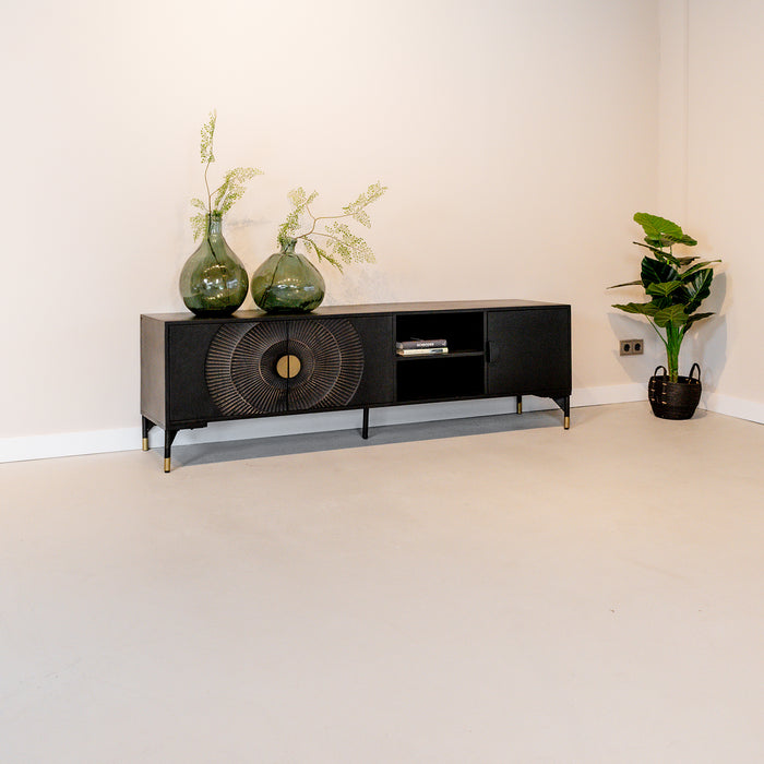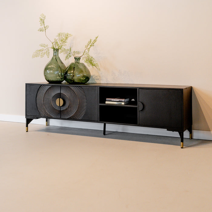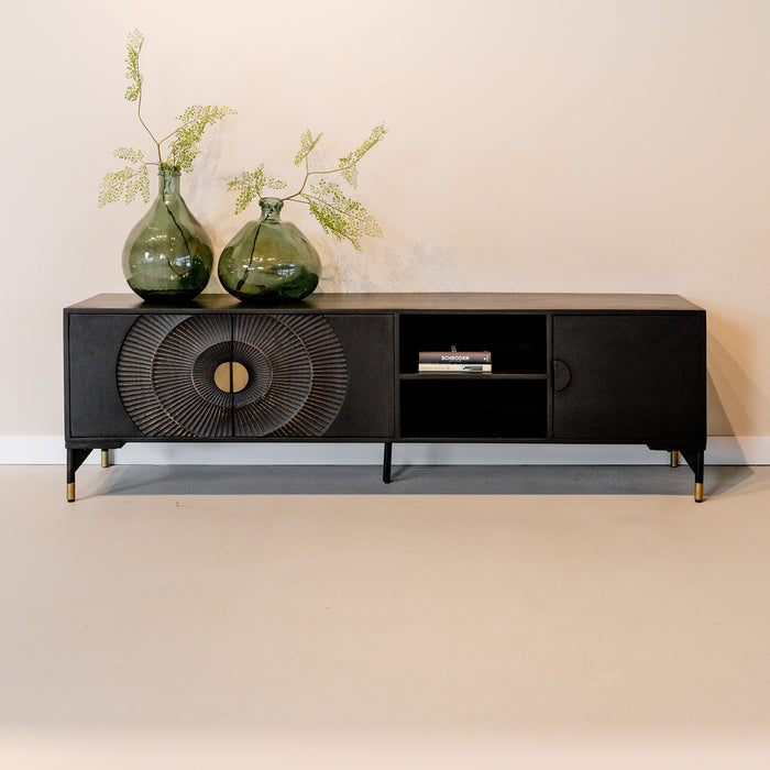 Dit prachtige zwarte TV-meubel is één echte eyecatcher in jouw woning! Dit mangohouten tv meubel is op de deurtjes voorzien van een mooi en bijzonder rond patroon geïnspireerd door de zon. Dit TV-meubel biedt met 3 deurtjes en 2 planken genoeg opbergruimte voor al jouw spullen en eventueel een ontvangen of andere apparatuur.