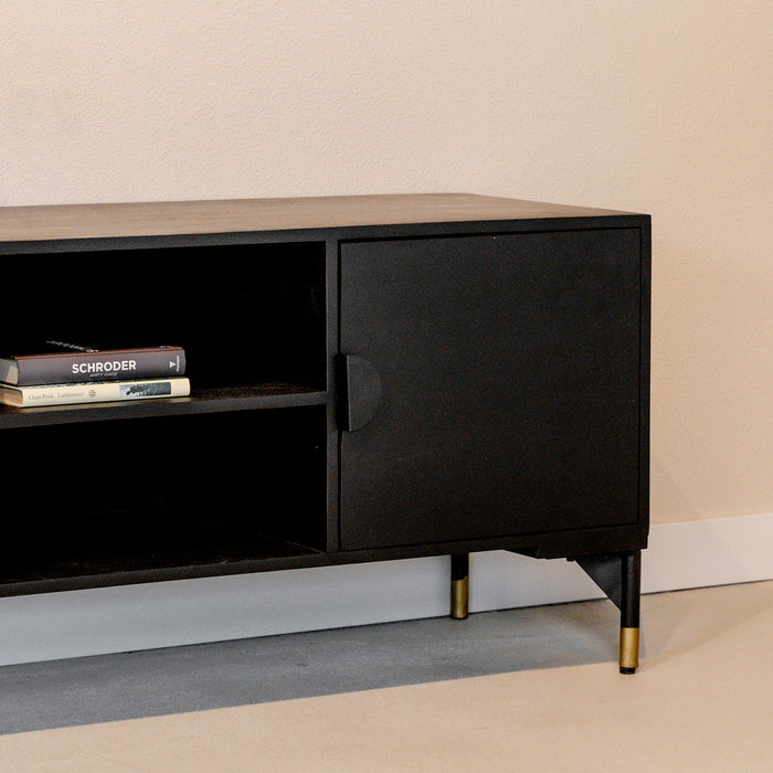 Gecombineerd met gouden pootjes geeft tv meubel Sun een perfecte en unieke touch aan jouw interieur. Van industrieel tot juist een modern of hotel chique interieur. Door de mooie donkere kleur steekt de tv meubel perfect af tegen een lichte muur of lichte houten vloer maar ook in een wat donkerder interieur past deze unieke tv-meubel perfect.