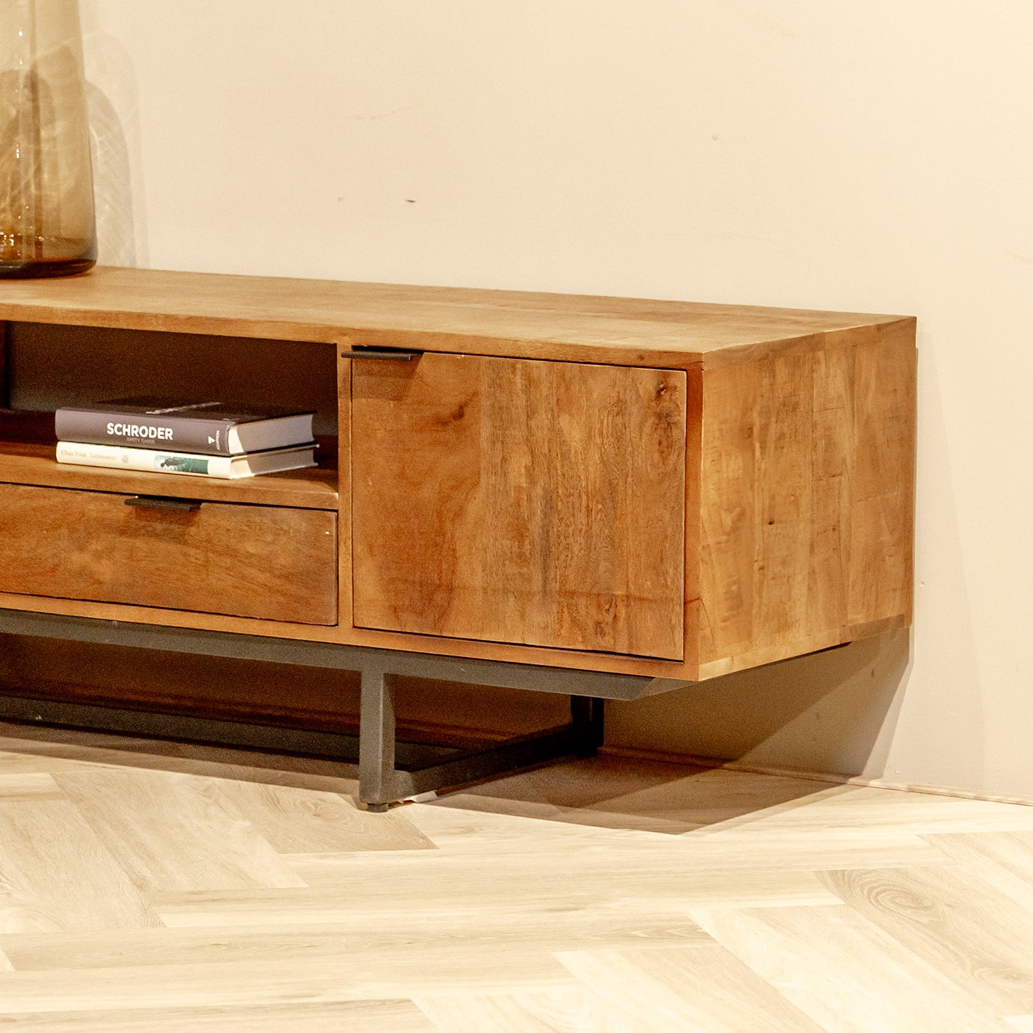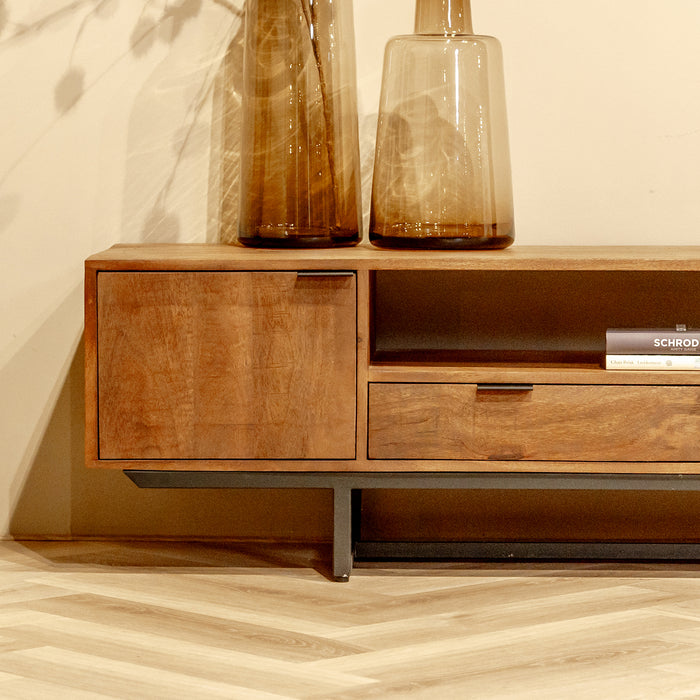 Buiten dat dit mangohouten TV-meubel in elk interieur past, heeft hij ook voldoende en functionele opbergruimte! Jouw apparatuur kan in het opberg vak of bovenop het tv-meubel geplaatst worden. Het TV-meubel beschikt over twee vakken met deurtjes, één lade en één open vak. Dit tv-meubel is in twee maten beschikbaar: 150 cm en 220 cm.