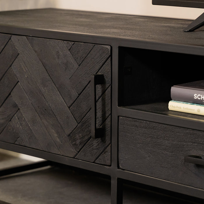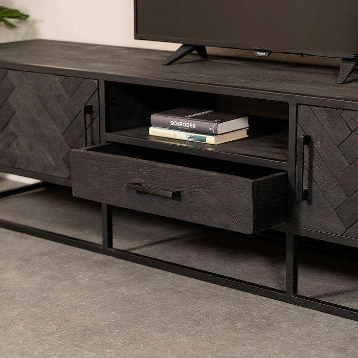 Deze prachtige TV-Meubel Yara Zwart Visgraat is één van onze meest populaire tv-meubels. Deze zwarte visgraat tv meubel is op de deurtjes voorzien van een mooi en modern visgraat patroon. De lades van de tv meubel zijn wel gewoon effen afgewerkt net als de bovenkant en de zijkanten.