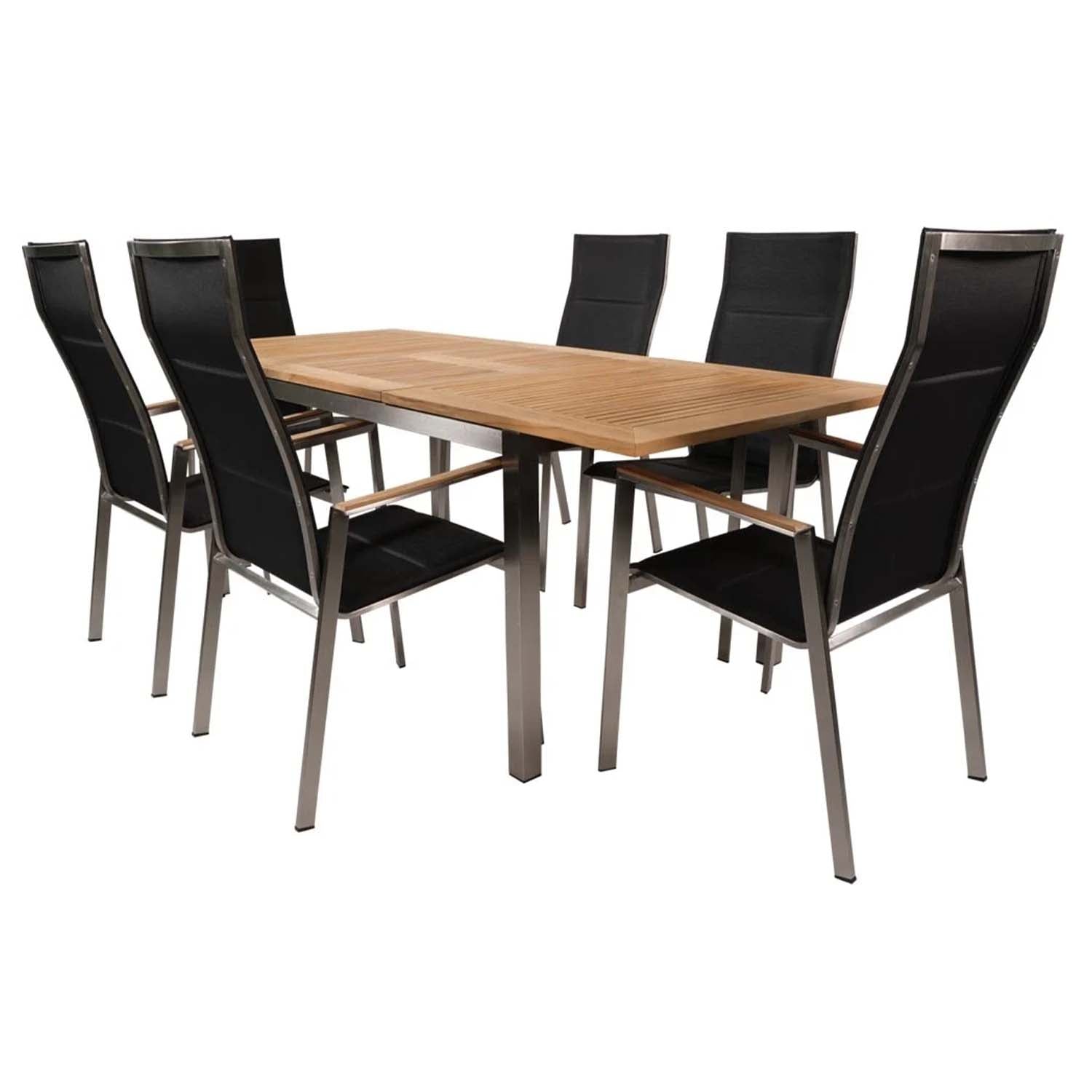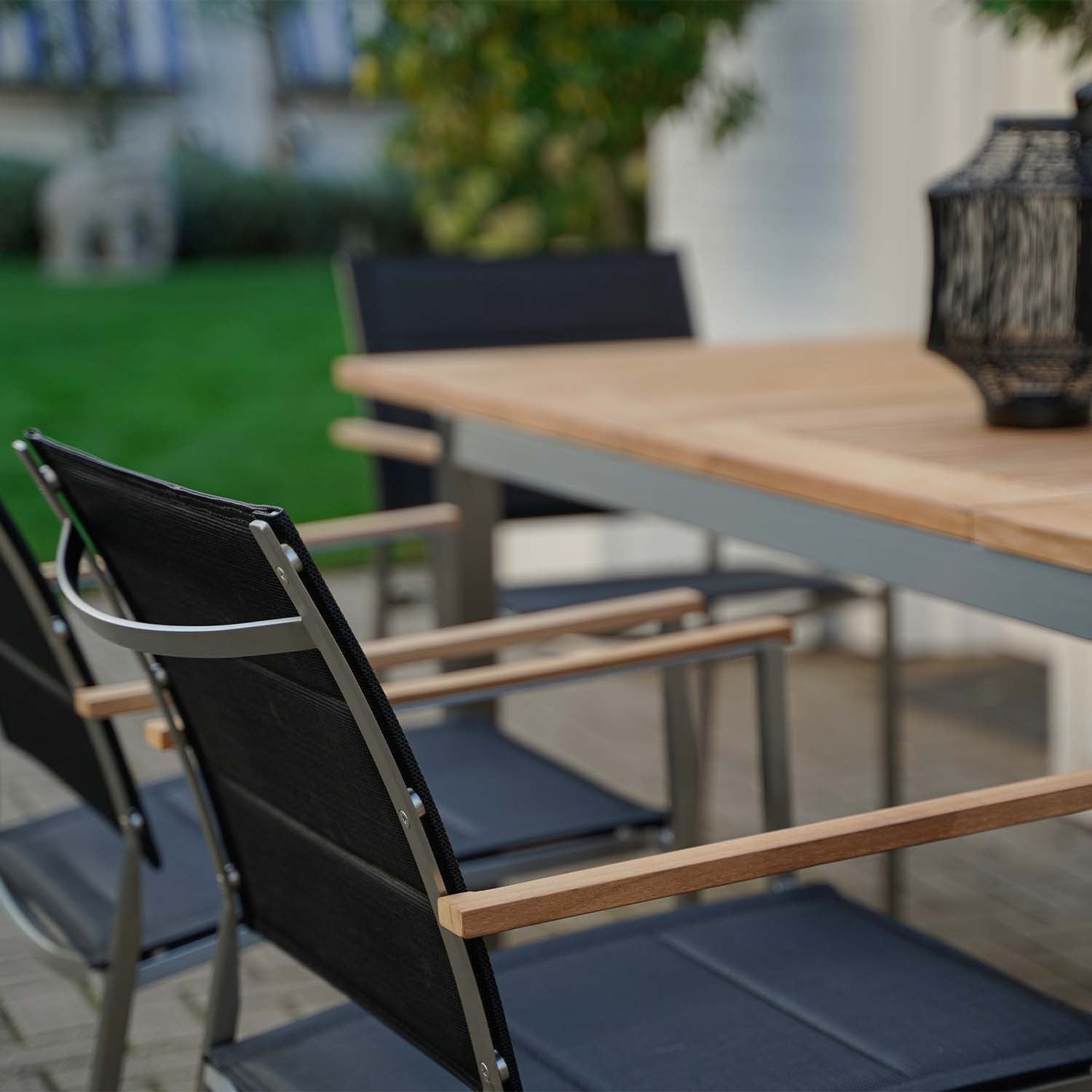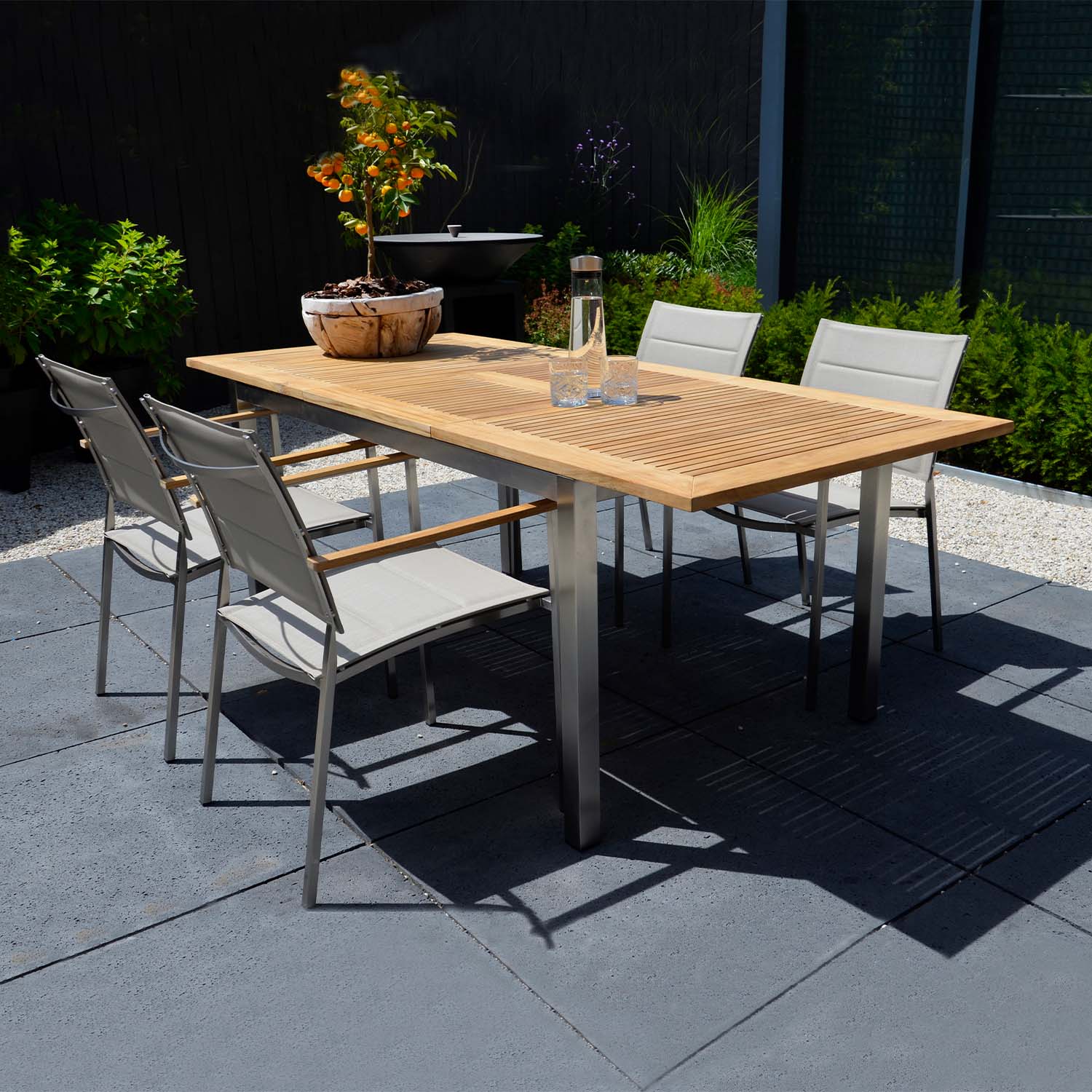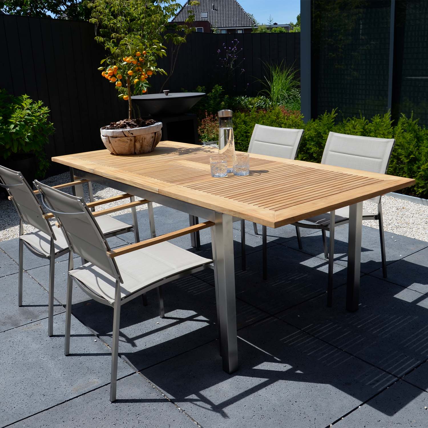 Dit tuinmeubel is voorzien van een 2,5 cm dikke teakhouten tafelblad, wat zorgt voor extra duurzaamheid en een luxe uitstraling. De afmetingen van 152/210x90x76 cm maken hem ruim en flexibel, ideaal voor zowel kleine als grote gezelschappen. Het roestvrijstalen frame en de 5x5 cm tafelpoten zijn bestand tegen slijtage en corrosie, waardoor de tafel langdurig zijn kwaliteit behoudt. De onderschuifhoogte van ongeveer 68,5 cm biedt voldoende beenruimte voor comfortabel dineren.