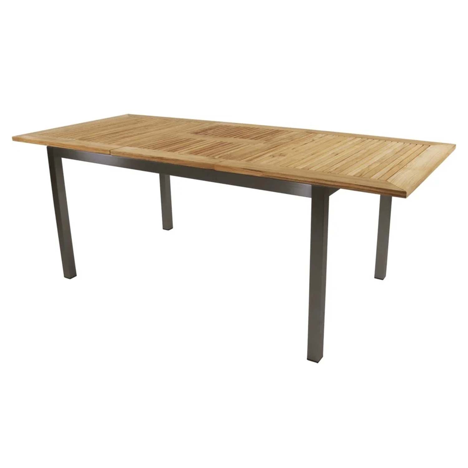 Het teakhout van de tafel geeft een warme en natuurlijke look die moeiteloos past bij diverse tuininrichtingen. Of je nu extra ruimte nodig hebt voor een diner in de buitenlucht of een comfortabele plek om van je tuin te genieten, deze uitschuifbare tuintafel biedt de perfecte oplossing.