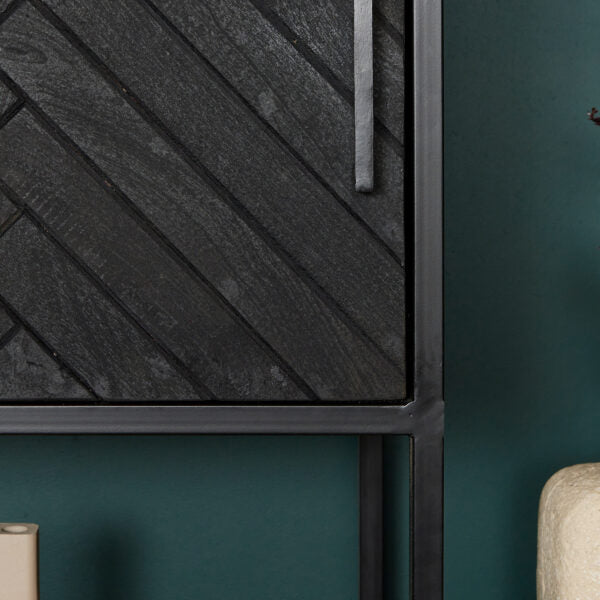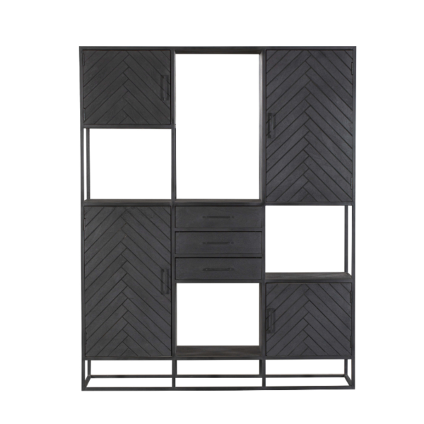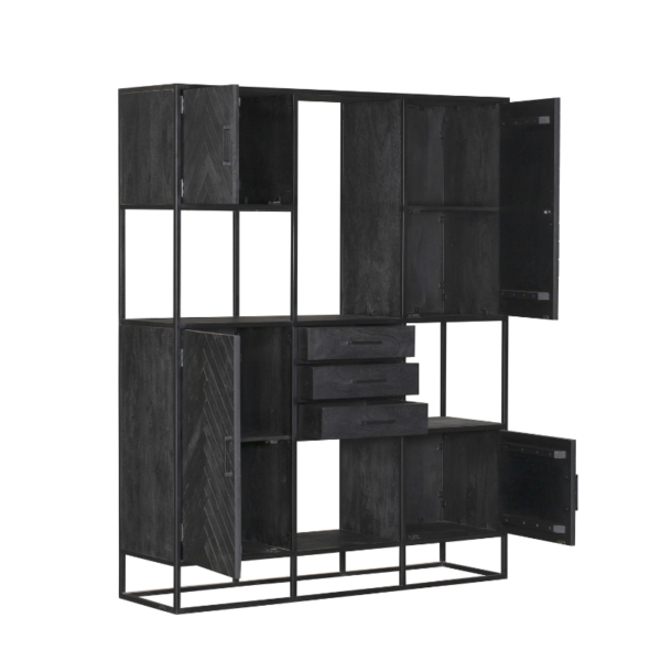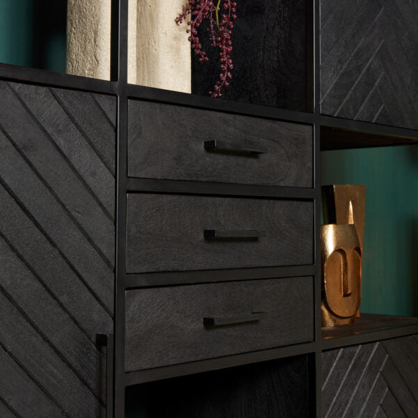 De 'Yara serie' Supreme XXL vakkenkast heeft een visgraatpatroon en bestaat uit drie lades, twee grote deuren, twee kleine deuren, twee legplanken en zes open vakken. Het metalen frame en de handgrepen zijn beide zwart gelakt, terwijl de basis van de kast is gemaakt van gezandstraald mangohout met een zwarte laklaag. Achter de twee grote deuren bevindt zich nog een extra legplank.