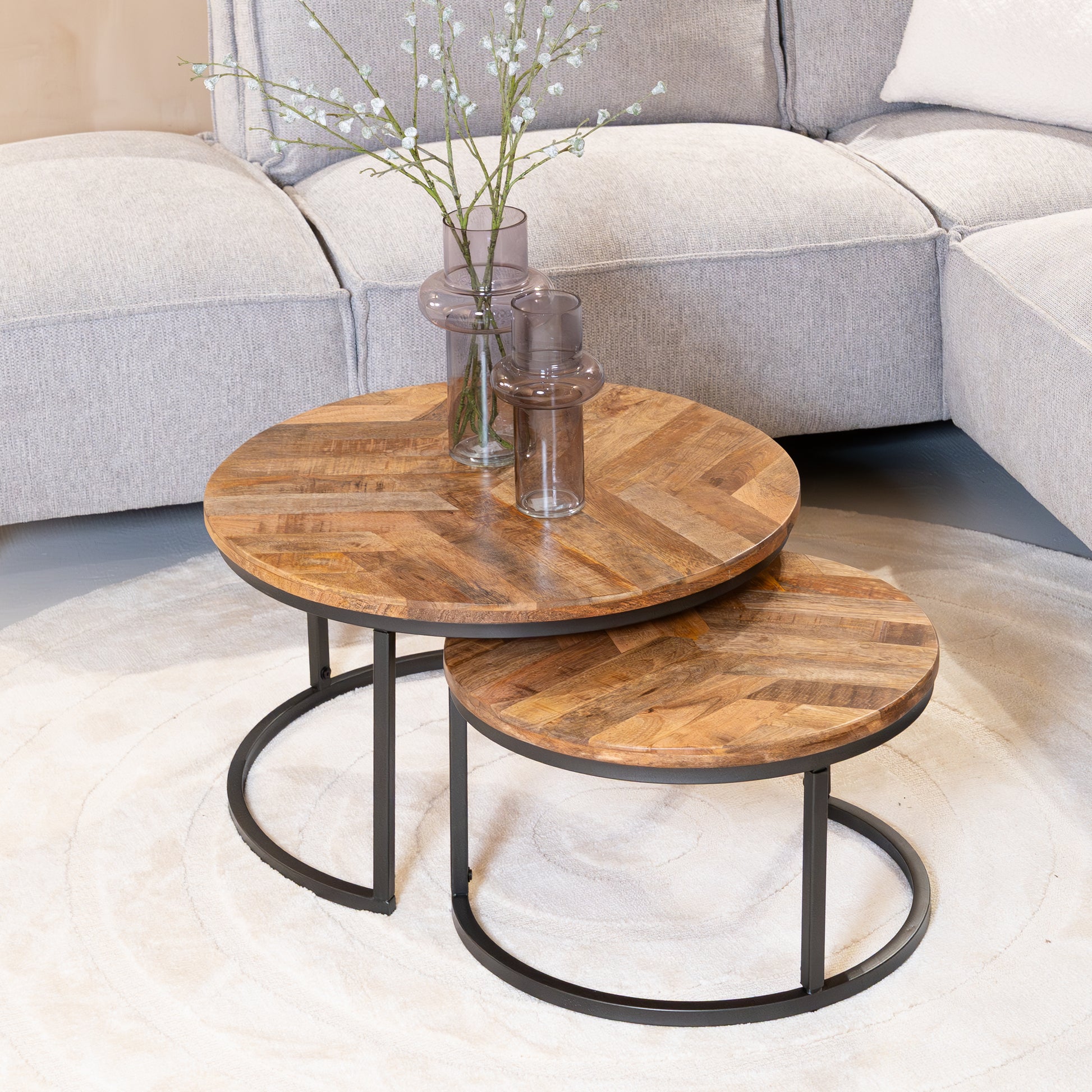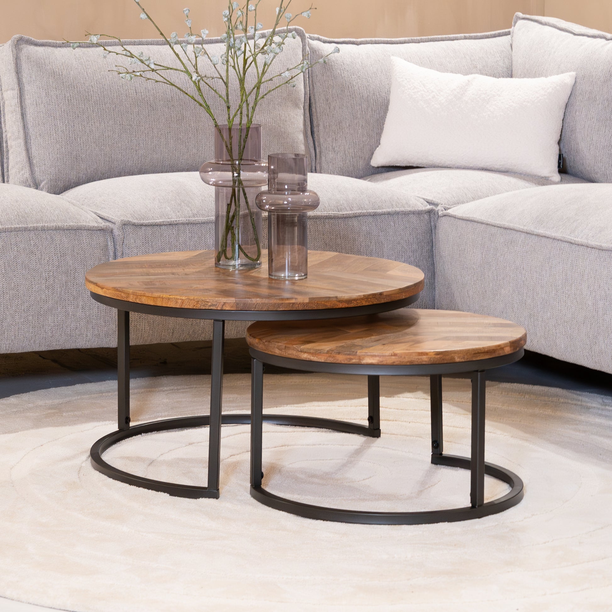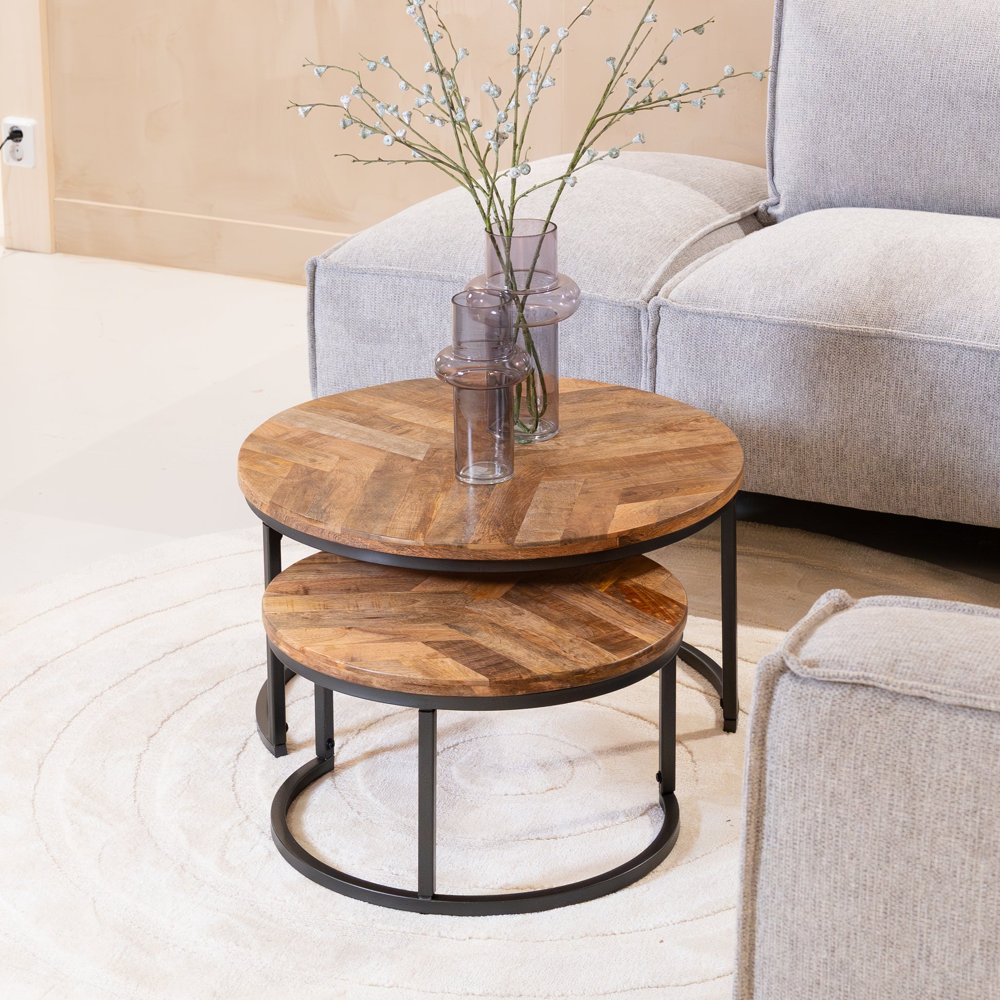 Afmetingen: Grote tafel Ø70x40 cm, kleine tafel Ø55x32 cm – flexibel inzetbaar in diverse ruimtes