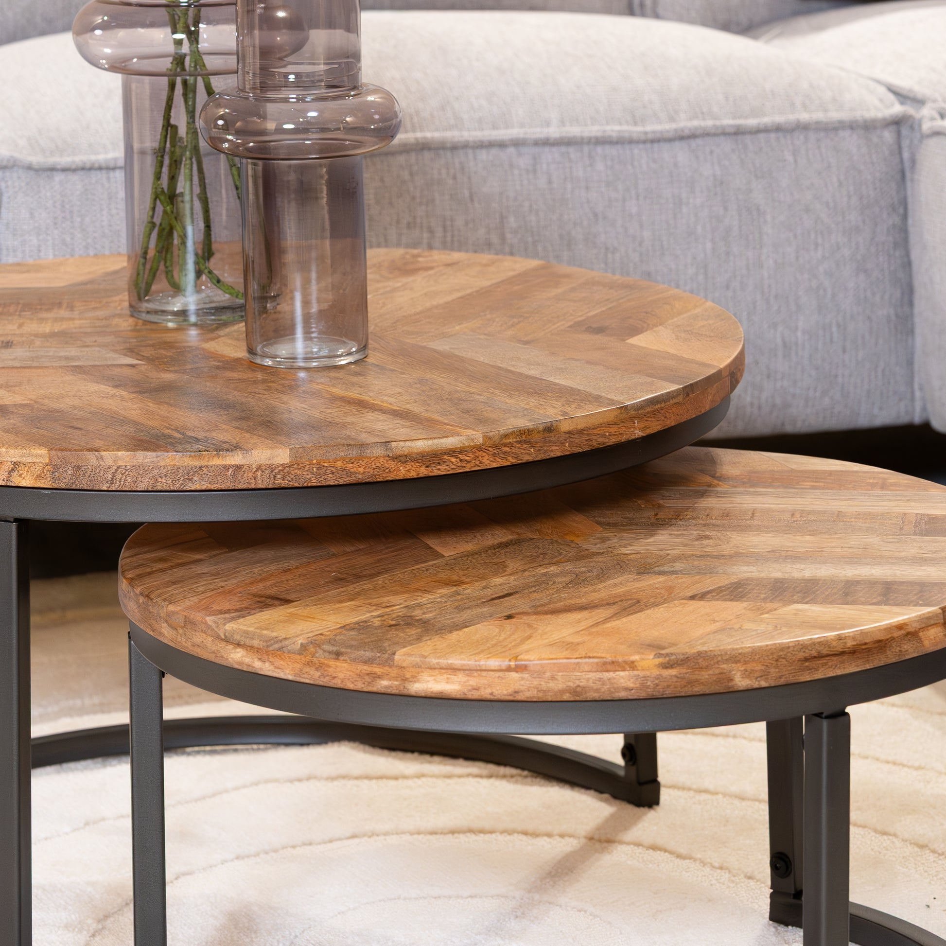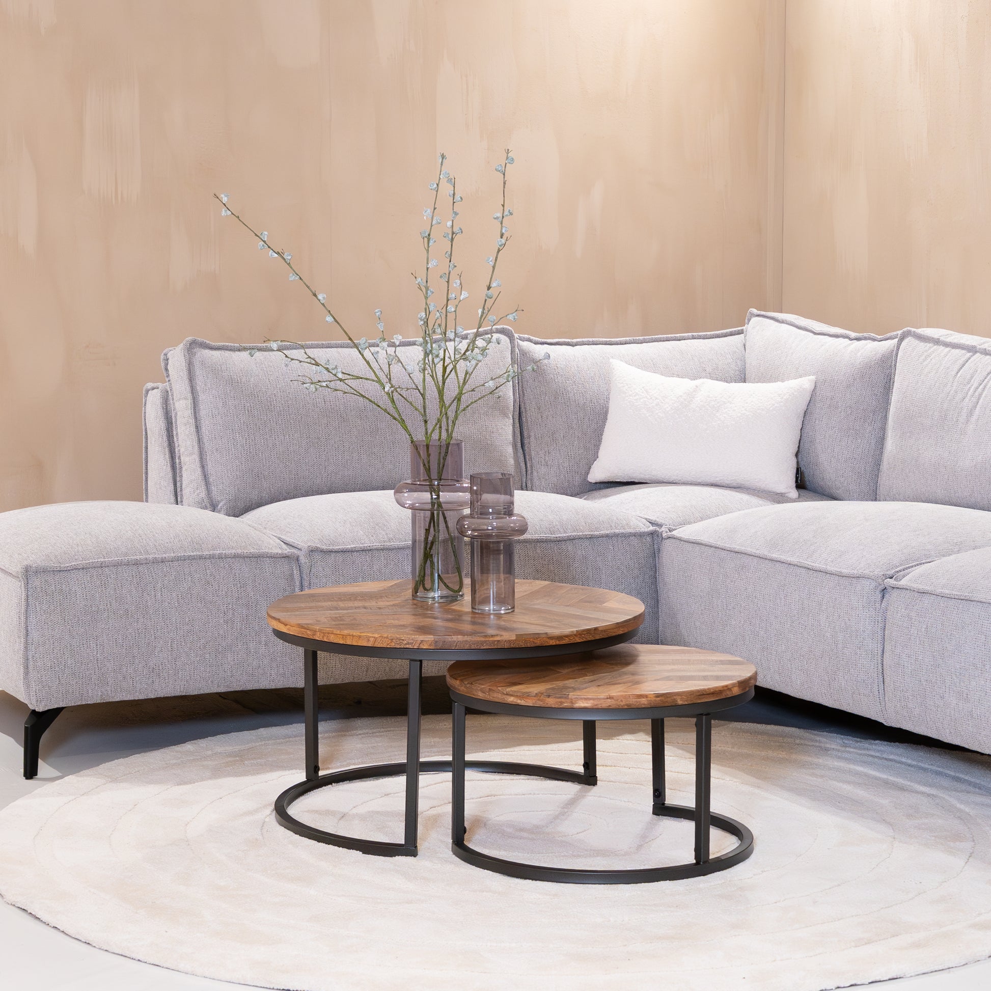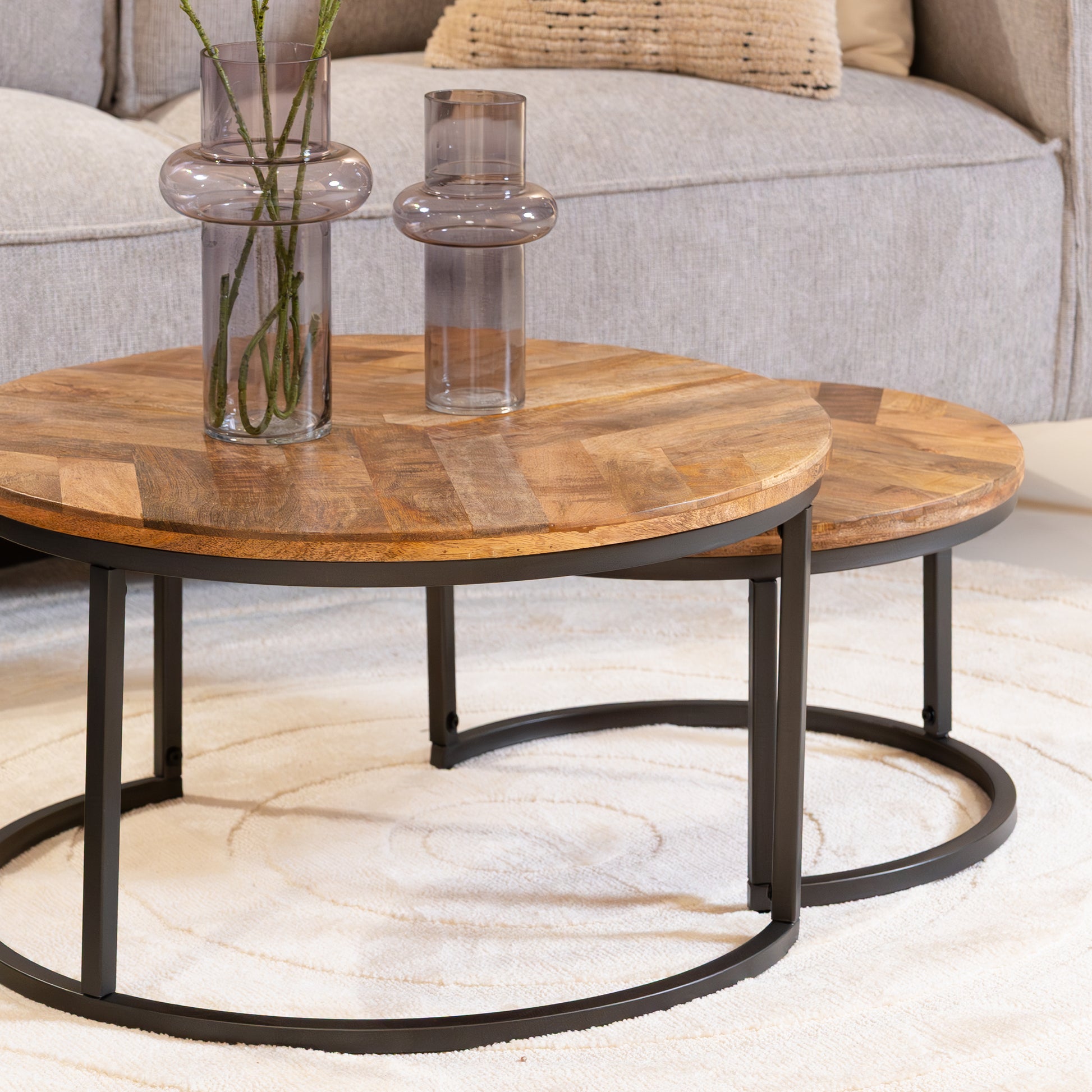 Afmetingen: Grote tafel Ø70x40 cm, kleine tafel Ø55x32 cm – flexibel inzetbaar in diverse ruimtes