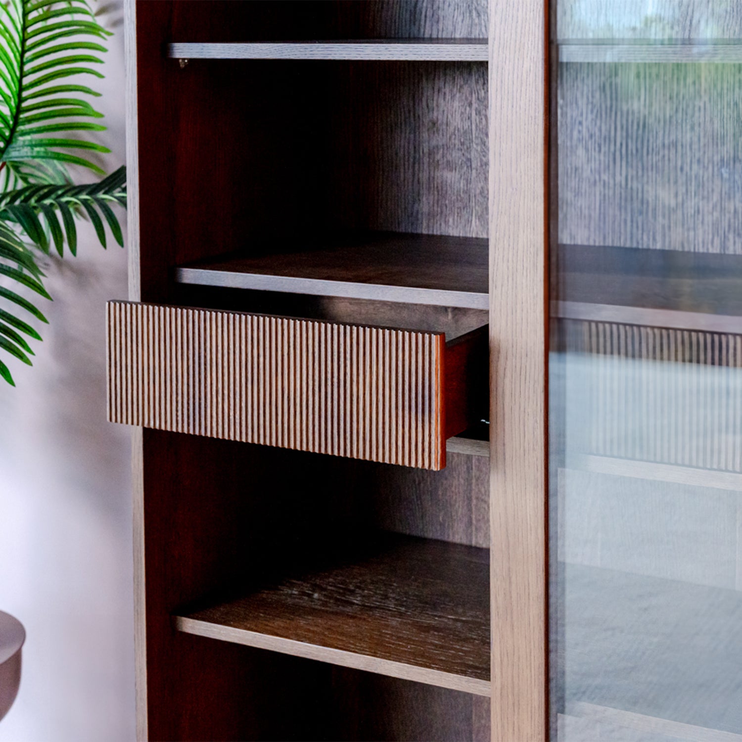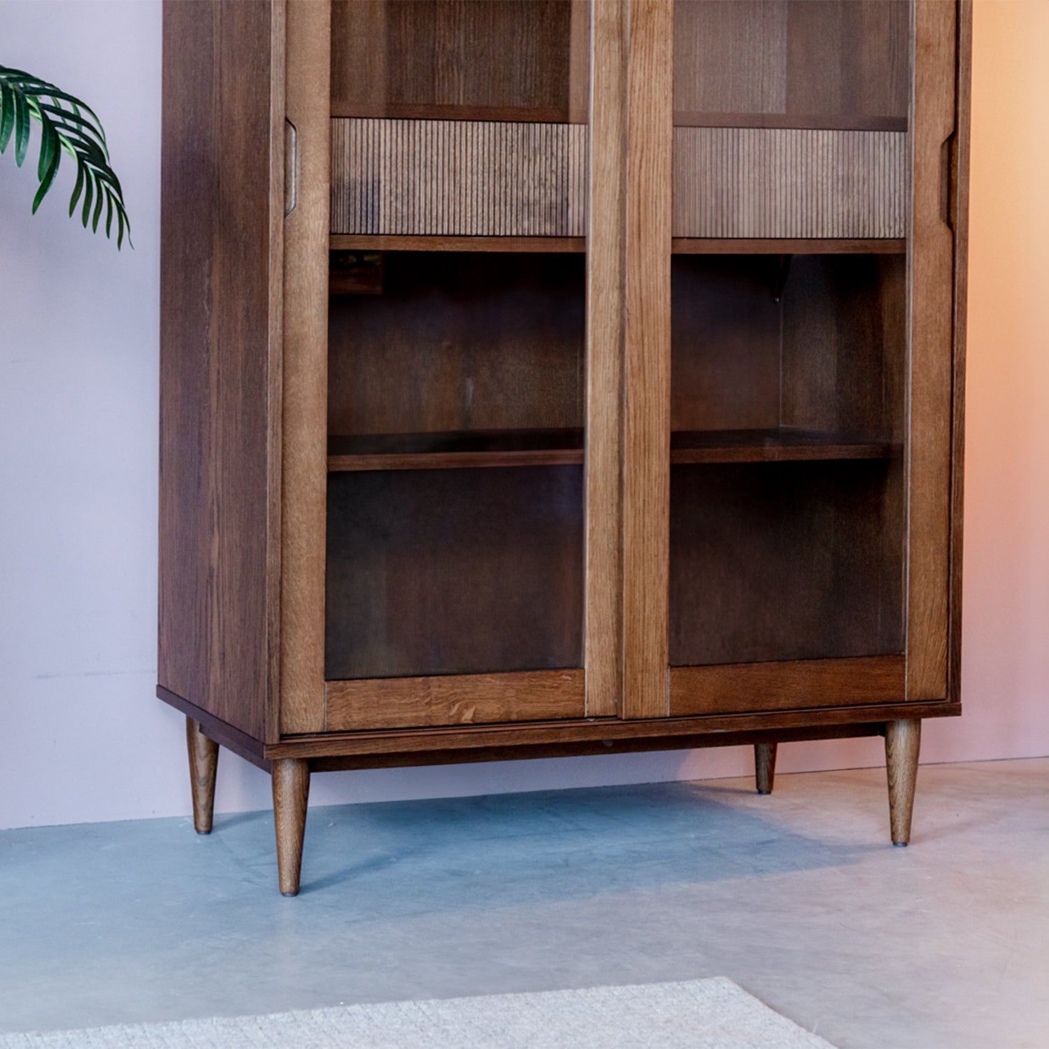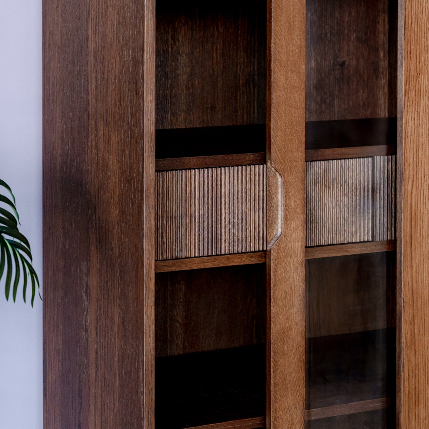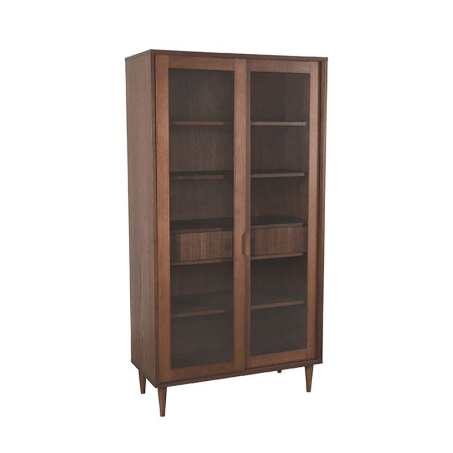 Maak kennis met onze trendy Vitrinekast Jule in Walnoot Eikenhout. Een stijlvol meubelstuk vervaardigd uit eikenfineer, dat niet alleen strak is vormgegeven, maar ook al jouw spullen elegant herbergt achter de grote glazen deuren. Deze vitrinekast is verdeeld in twee delen met vijf opbergvakken, en in het midden vind je twee lades die voor een speelse indeling zorgen. De hoge poten geven een luchtige touch aan het geheel.