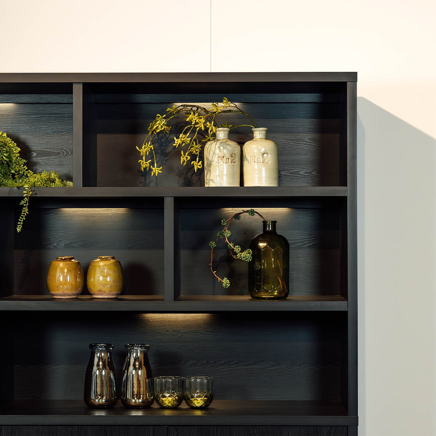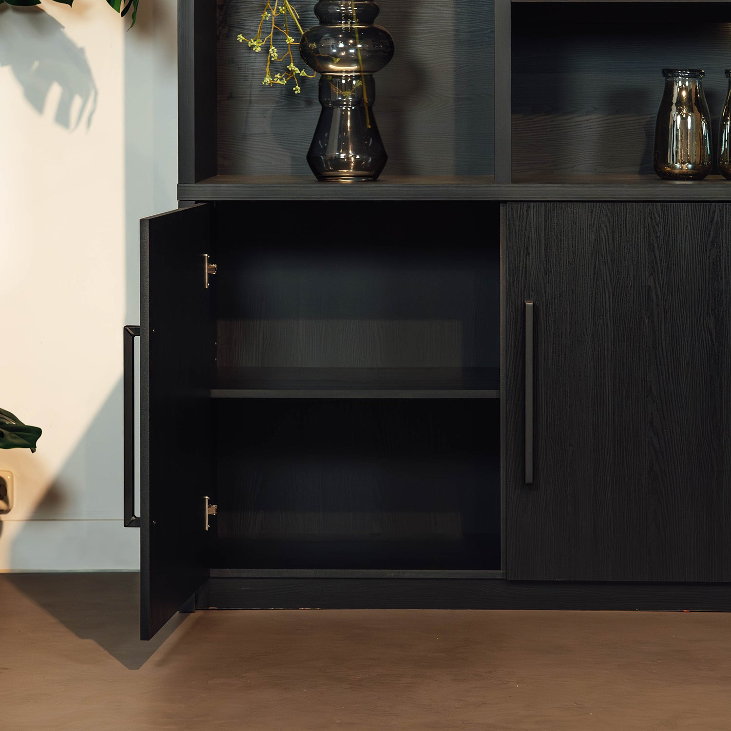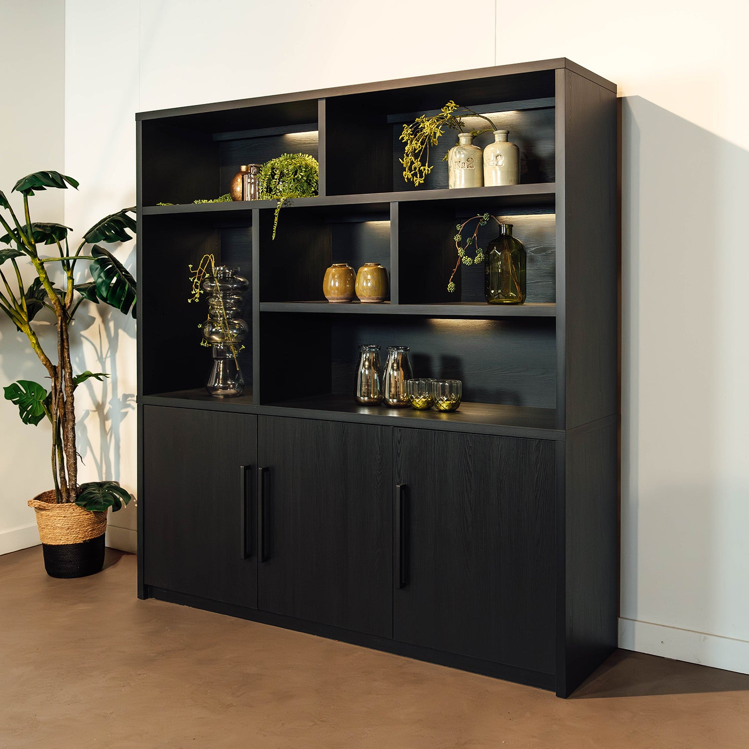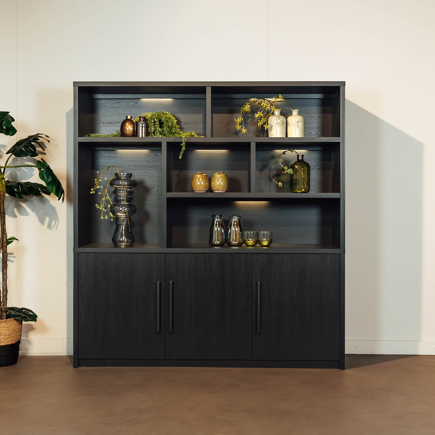 De 180 cm (180x45x187 cm): Deze variant beschikt over 3 deuren en 6 open vakken, waardoor hij nog meer opbergruimte biedt en perfect past in grotere woonruimtes. De kleine open vakken in deze kast hebben de afmetingen 85x43x33, 55x43x33, 55x43x70cm. Het grote open vak heeft de afmeting 114x43x33cm. Ook bevinden zich 6 ingebouwde ledlampen in de kast.